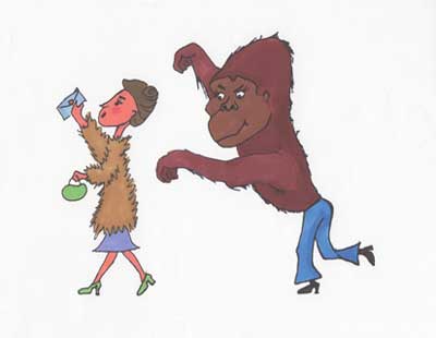 She backs away. I chase her , baring my teeth, swinging my arms at her and making noises like the gorilla at the Bronx Zoo when he wants someone to feed him a banana. Mrs. Mink Coat beats a hasty retreat out of the stationary department. I return to the sales desk. The crowd parts for me. They let me go to the head of the line. I pay for my things and leave.