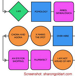 The timeline section establishes a chronological context, in which artwork is linked to preceding pieces in flowchart form. Each type of work (small paintings, large paintings, silhouettes) is replaced with a corresponding color-coded symbol. Blue squares, orange circles, green diamonds become signifiers; labeled only with a title, they conceal the image until it is selected. The relationship between text, image and meaning become interchangeable - reflecting Sharon Gold’s densely layered, creative process and her continued exploration of visual semiotics.
