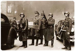 lingering on the corner, near Pawiak Prison. Deliberately he steps,